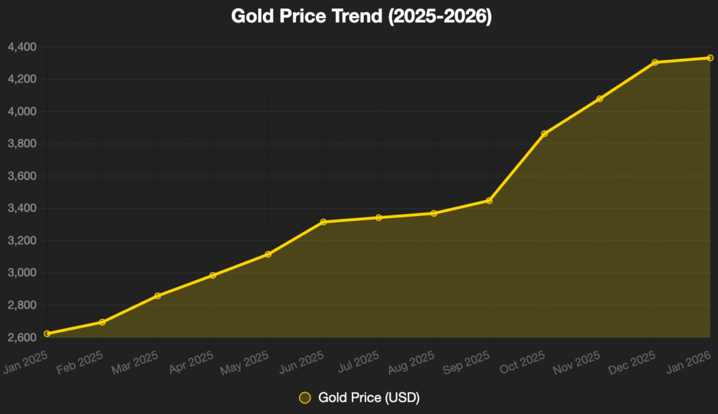 This marks a staggering 65% increase from the start of 2025, when prices sat at approximately $2,624 per ounce.